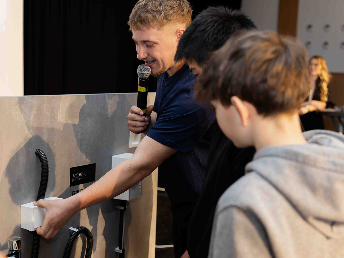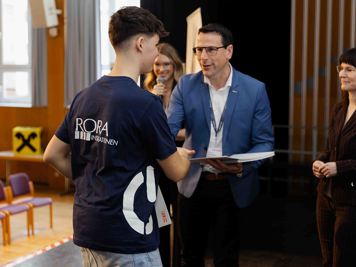 Bei der GUUTE-Lehrlingsshow in Puchenau präsentierten unsere Lehrlinge Lukas (Elektrotechniker) und David (HKLS-Installateur) ihre Berufe vor zahlreichen Schülerinnen und Schülern.